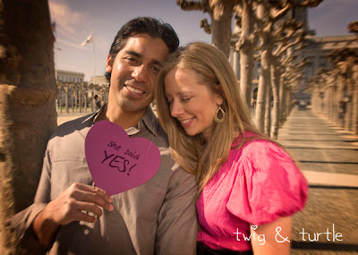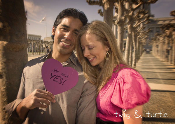 Ok. I admit it. I’ve been slacking on the Tuesday updates, but I have been a very busy bee. So instead of a Things We Love post today, I want to show you one of the things I’ve been up to. Meet Pedro and Heidi. They got engaged on New Years Eve and I finally made it down to San Francisco last weekend to take their engagement photos. We visited City Hall and Golden Gate Park as well as some streets and a fountain. They were great and it was a lot of fun. The one almost hitch in the day was when the parking attendant asked us to leave our keys. I was wondering if we would have a Ferris Buller moment but I got my car back safe and sound and the odometer was where it should be.