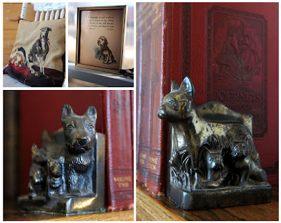 This a collection of dog items, book ends, a pillow and little picture. They are masculine and would look very sweet in a little boy’s room. But look closer. The red from the books ties in with the red in the pillow and the red in the dogs collar. Also the background colors in the pillow matches the background of the framed dogs picture. Even the patina of the book ends matches the pillow and framed picture. These are items I have in my own home, and I got them years apart. My friend gave me the bookends right after we got out of college. The pillow she gave me from her mothers house eight years later and the framed art I found at an antique show for $5. They all used to live in different rooms but together they make a great unified collection. And I didn’t spend a lot of money.